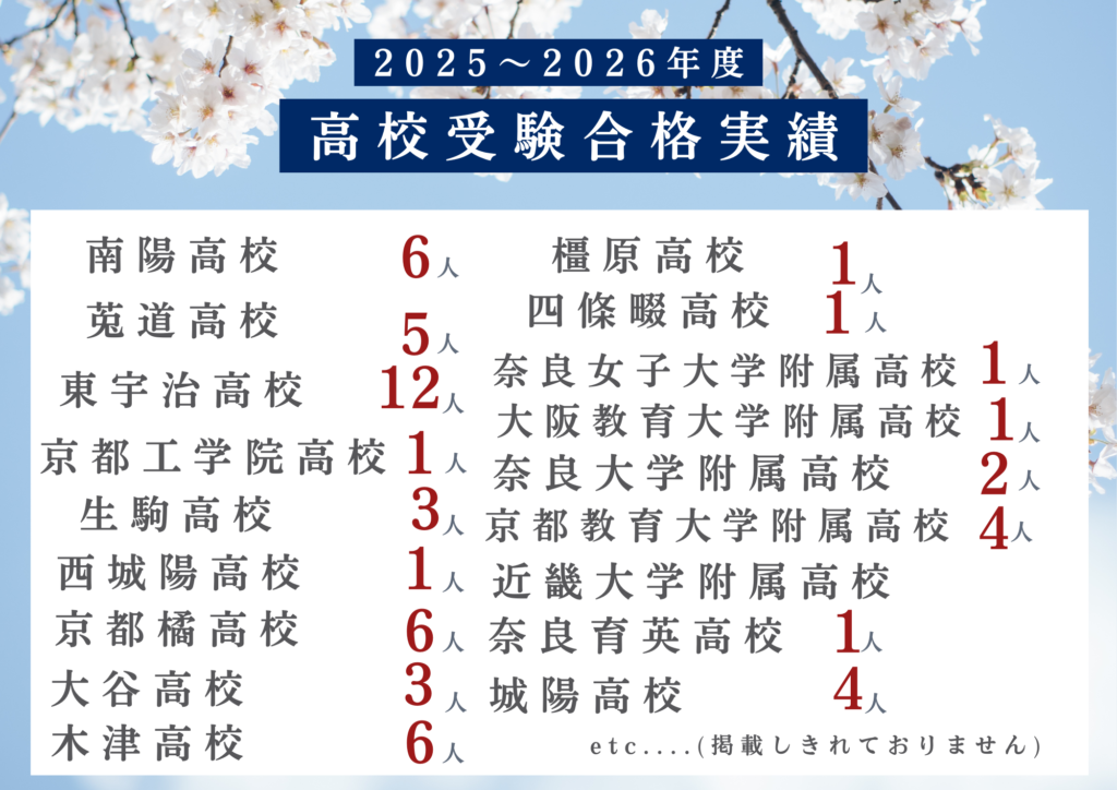 生徒たちの進学先:京都教育大学・南陽高校・城南菱創高校・一条高校・東宇治高校・莵道高校・西城陽高校etc….