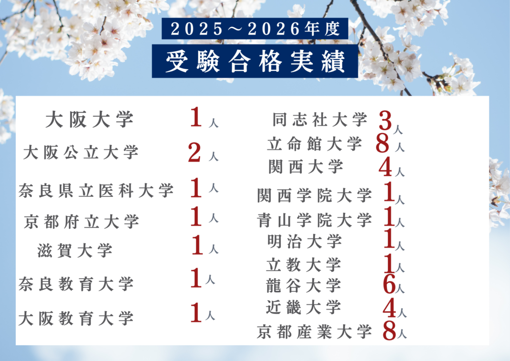 現在の受講生は 奈良教育大学・京都教育大学・大阪公立大学・奈良県立医科大学・関西学院大学・同志社大学etc…. といった大学進学を志望している生徒が多いです。